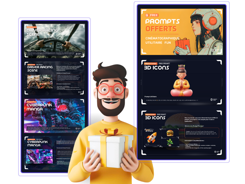 Un Top Prompt créé par nos soins te sera également offert, avec les instructions pour l'utiliser (il suffit de remplacer les informations entre crochets par les tiennes), ses différentes utilités et plusieurs exemples !